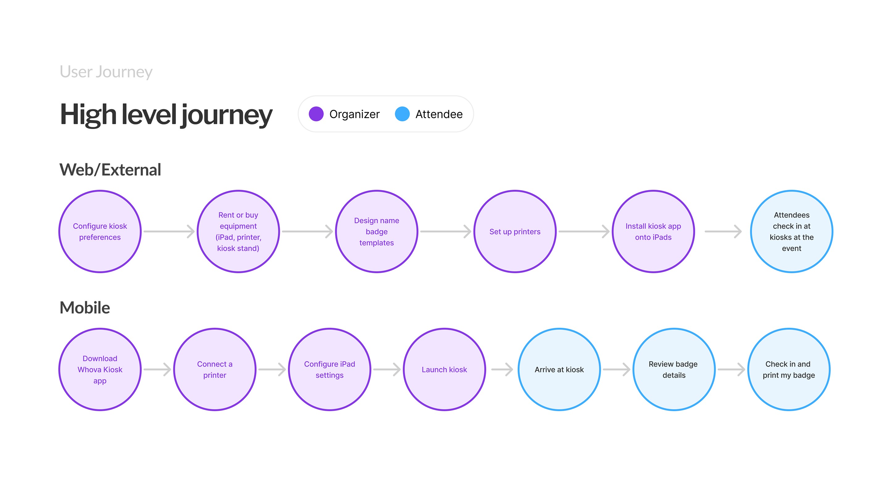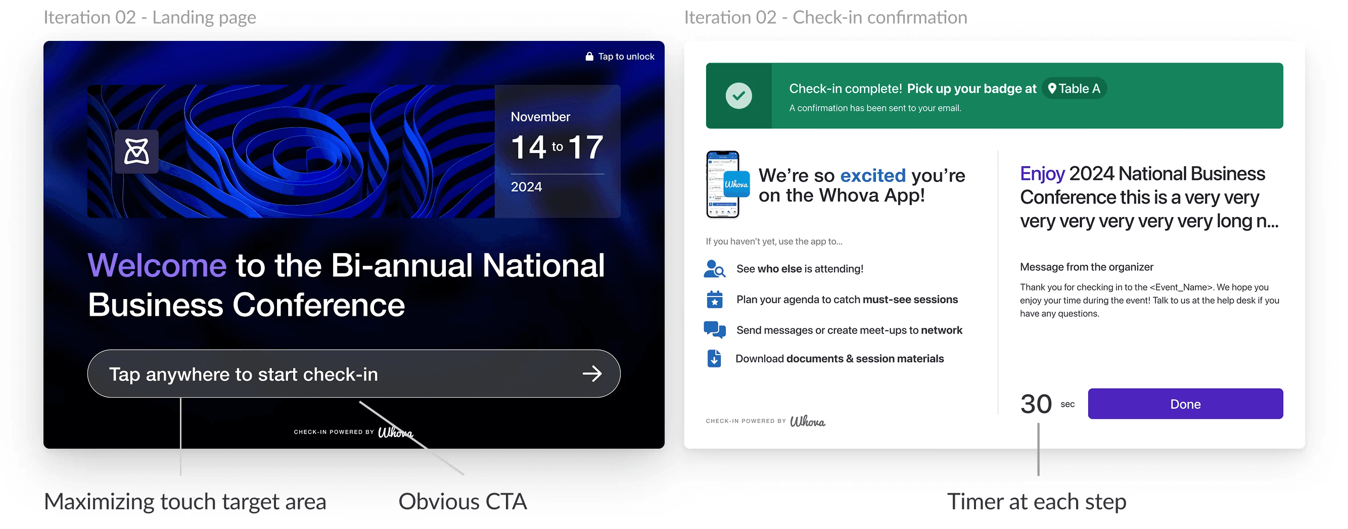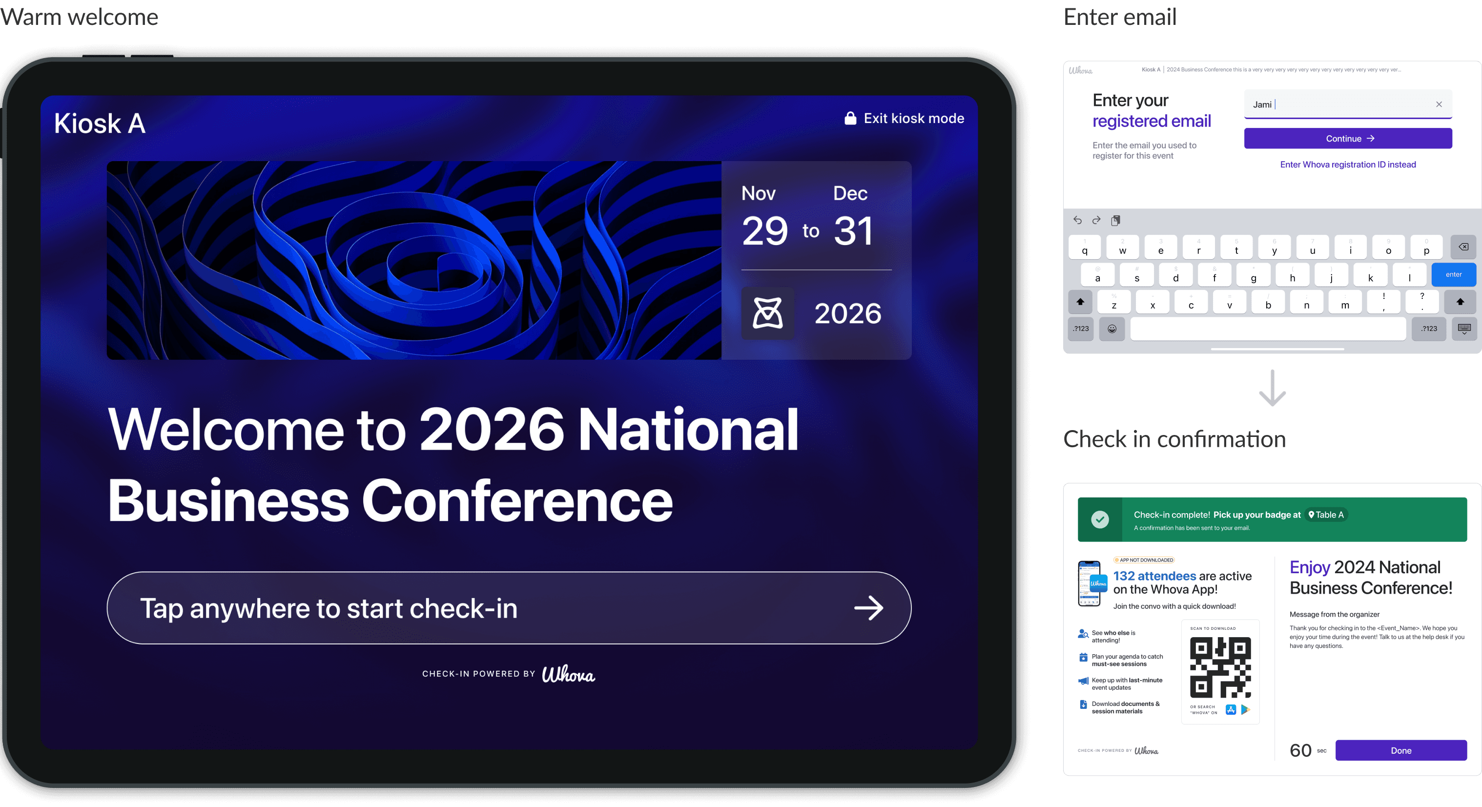 Whova is a comprehensive event management platform designed to help organizers plan, promote, and hold various events, from conferences to expos. My work at Whova has been varied, but with a focus on the Trial Onboarding and Check-in features. Below is a deep dive into the Kiosk Check-in project, where I helped design self-serve kiosks to support fast, reliable check-in at events.