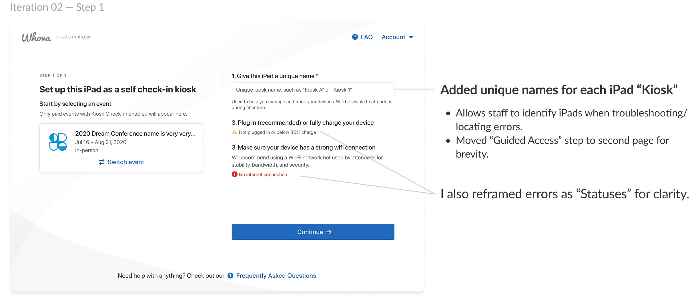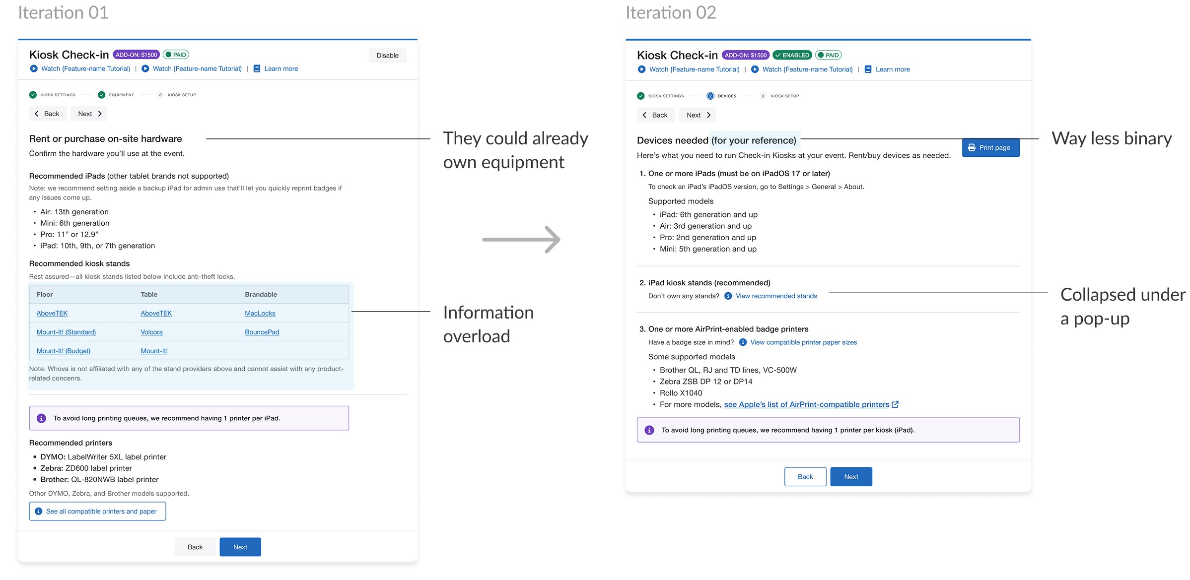 Simplifying the equipment checklist and adding completion checks reduced setup anxiety and helped organizers trust that everything was ready. Before demo, I never considered how a long checklist could present emotionally, especially to users who might be trying out kiosk printing for the first time.