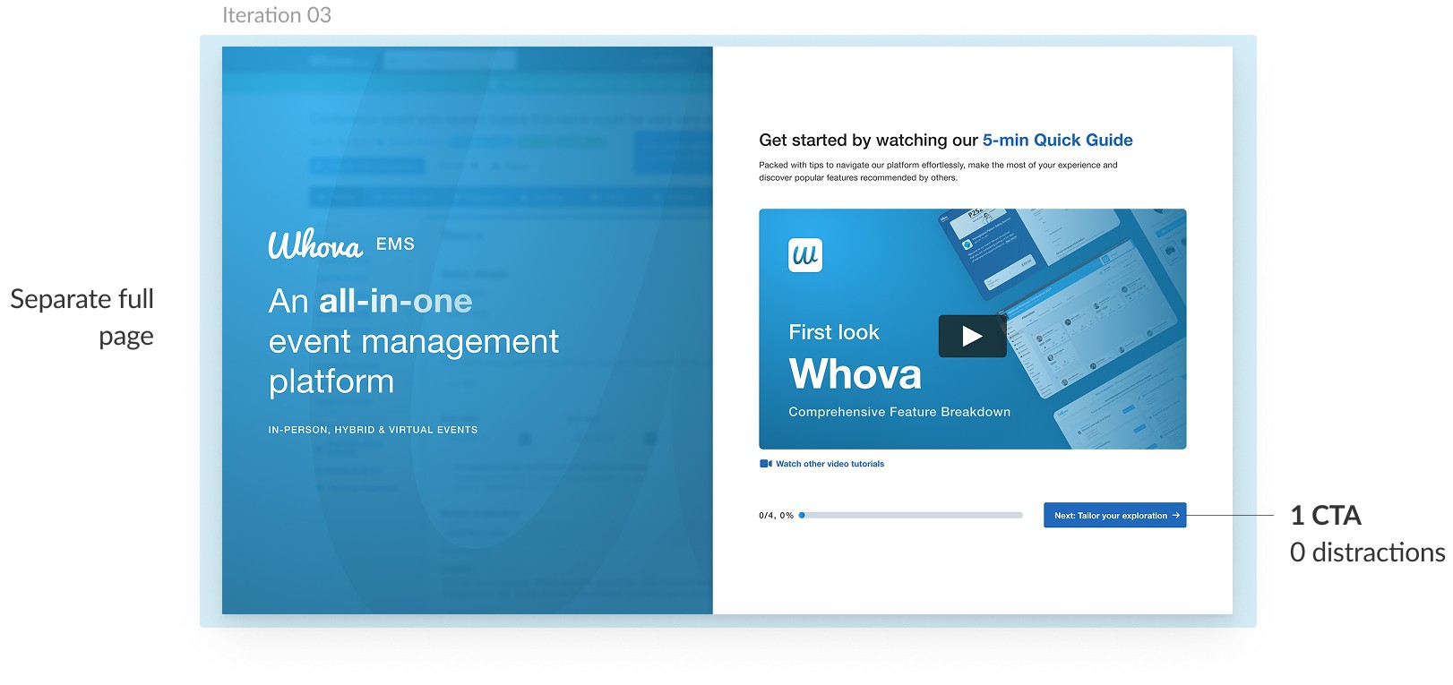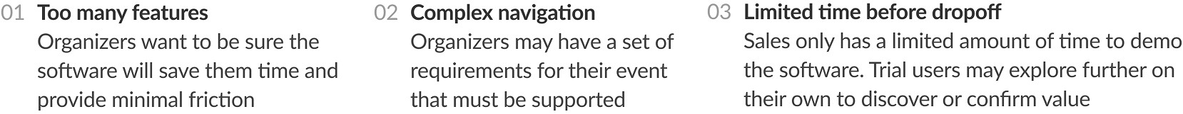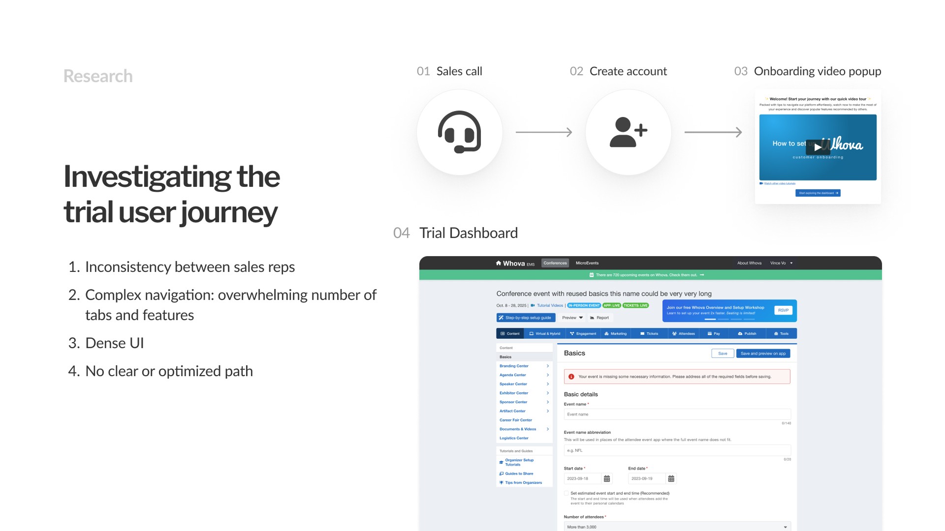 Many Whova Trial users were not exploring past the first tab of the Whova dashboard, meaning they weren't exposed to a vast majority of Whova’s features.