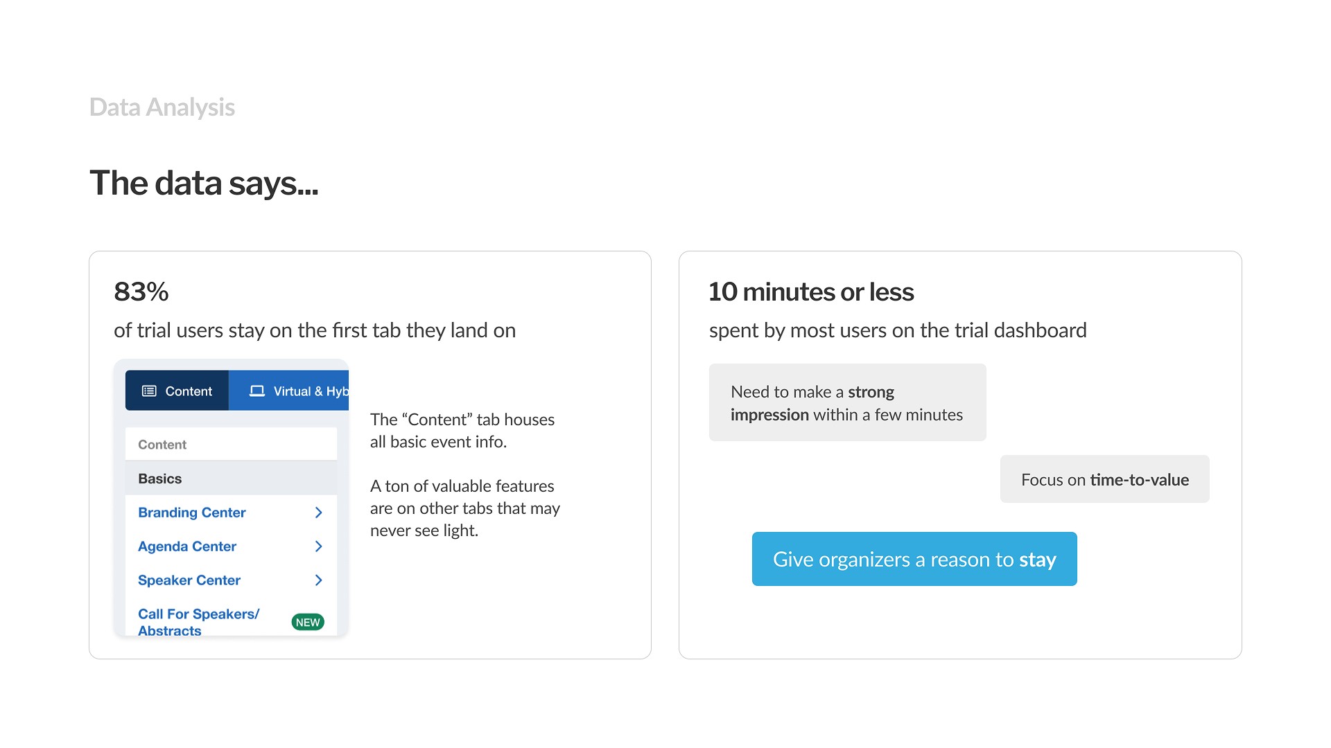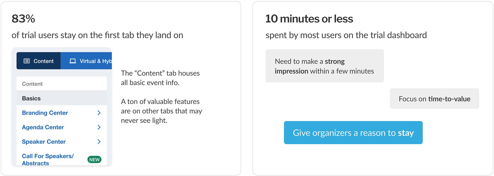 If users explored even a bit more, the chances of sparking an ‘Aha!’ moment that could turn into a conversion were far higher. Exploration would also provide time for users to discover value not covered in brief sales demos and find relevant add-ons (cross-selling opportunity).
