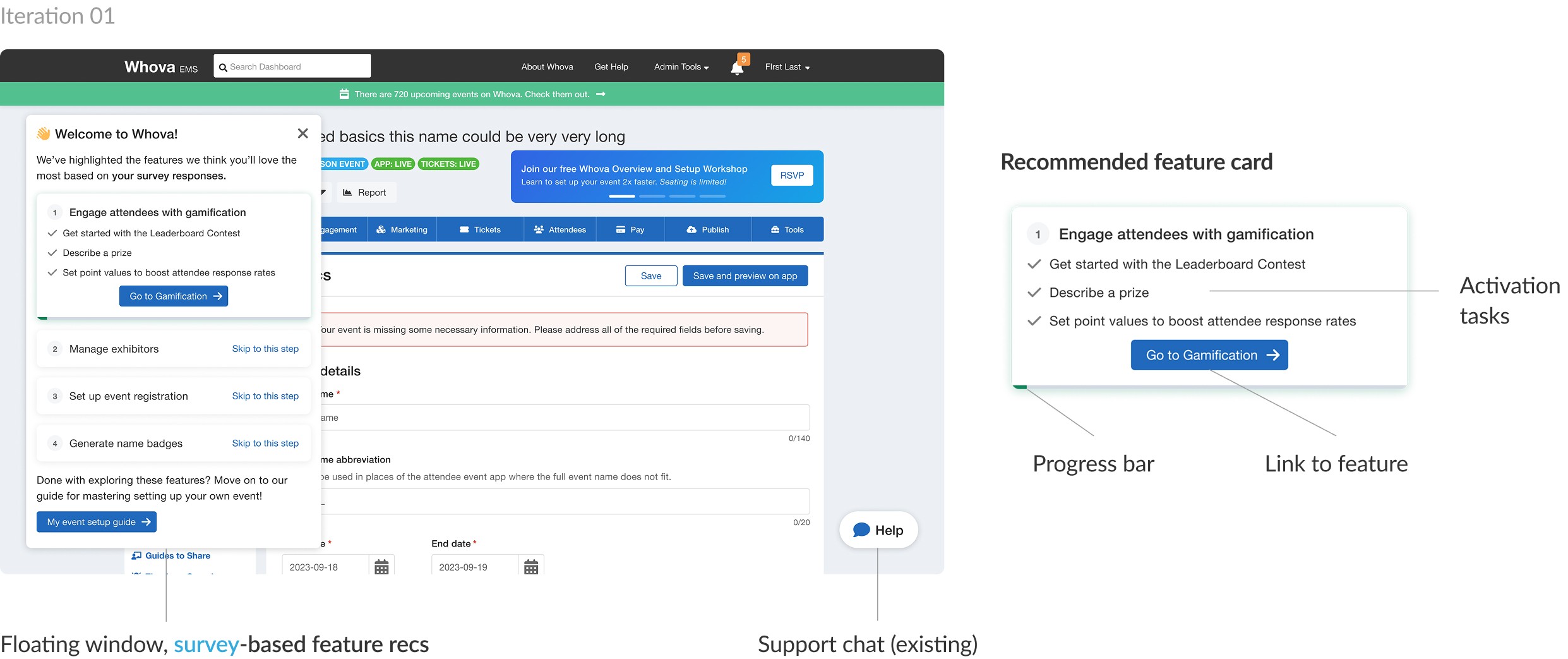 Whova is a comprehensive event management platform designed to help organizers plan, promote, and hold various events, from conferences to expos. My work at Whova has been varied, but with a focus on the Trial Onboarding and Check-in features. I've included below my work through multiple projects on our customer onboading dashboard.