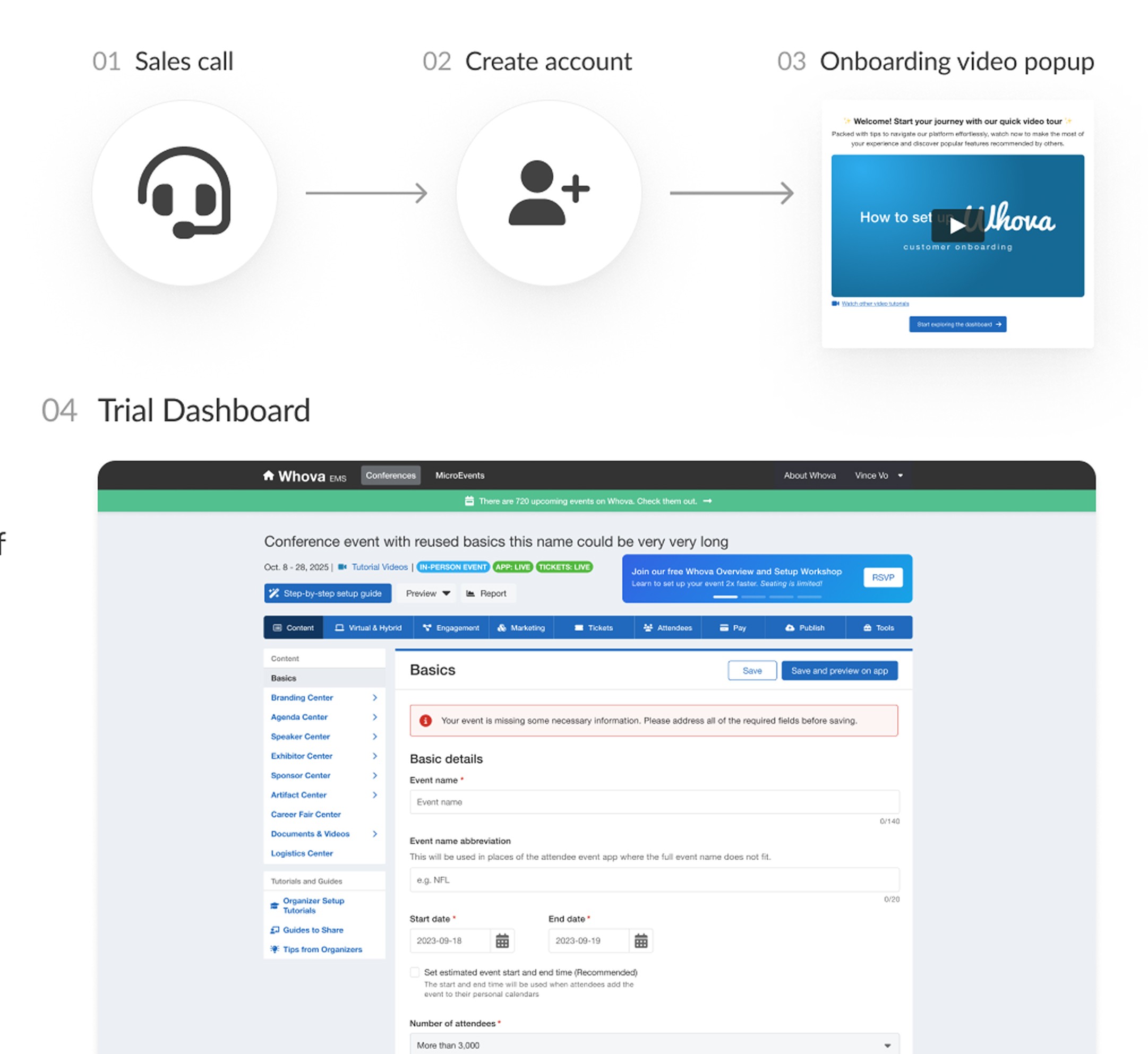 Trial users rarely explore past the first pages of the Whova dashboard, leaving a vast number of features untapped